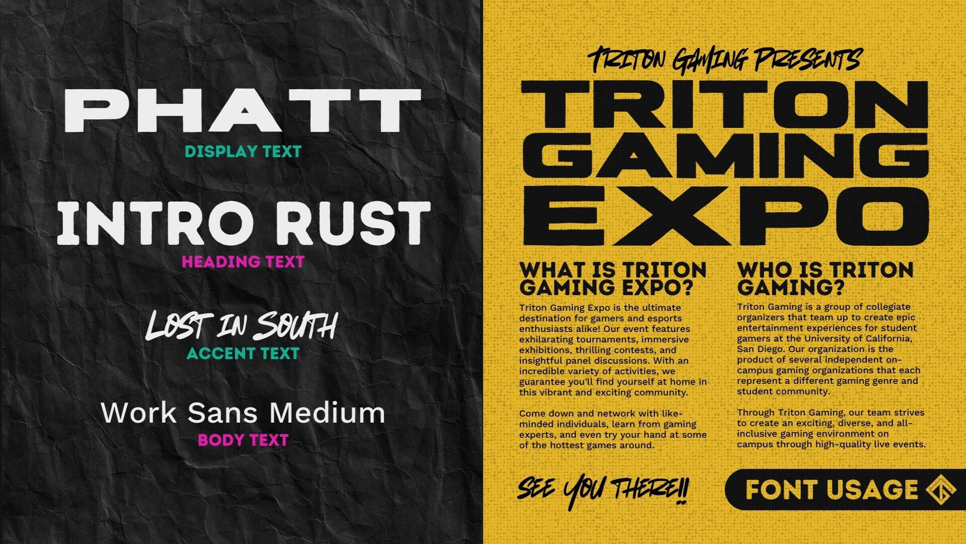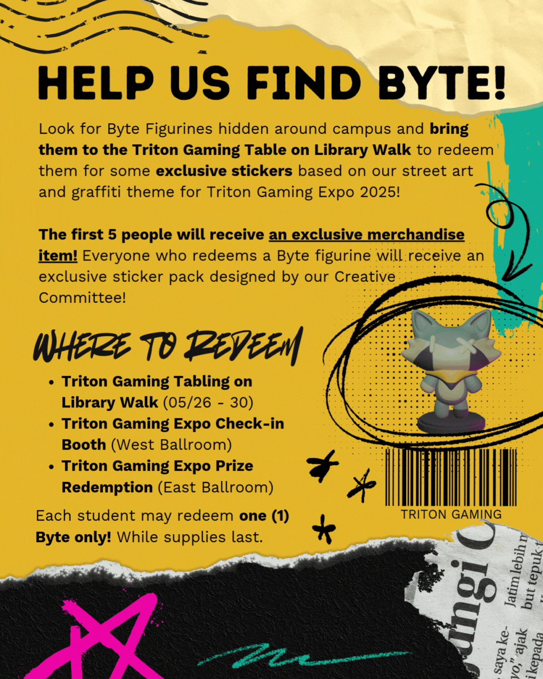 Triton Gaming Expo is an annual gaming convention at UC San Diego, averaging over 2000 unique student attendees. As the creative director of Triton Gaming from the 2024-2025 school year, I was tasked with creating the branding guidelines for their gaming convention that year. Drawing inspiration from graffiti and street art, a lot of noise, spray paint, and grunge textures alongside digital illustration were incorporated, using strong typography to ground the designs.